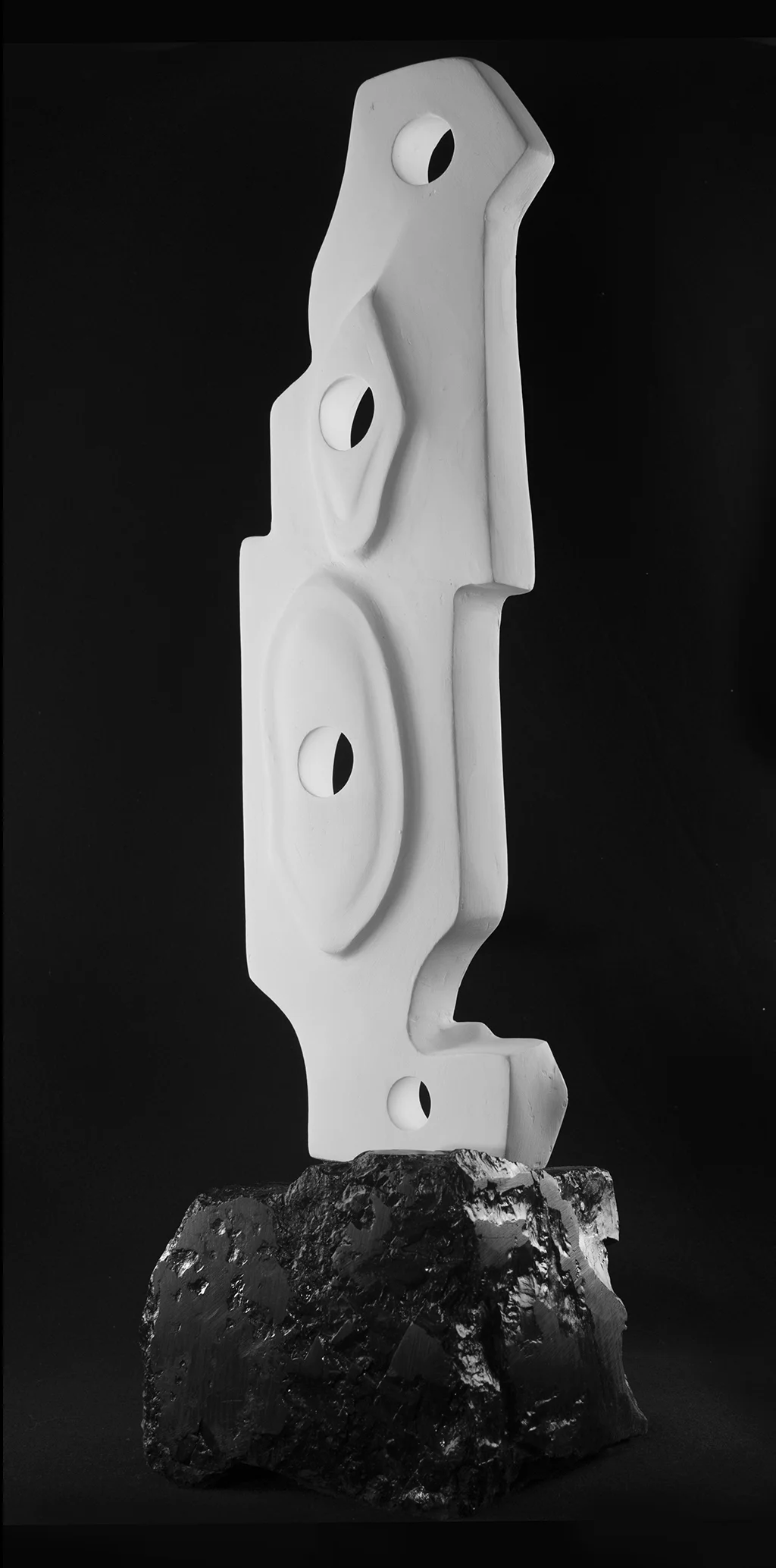 The use of coal is significant when referencing the cycle of life and technology. This totem represents alterations of protein structure (in plaster) that is resting on a black block of coal - formed hundreds of millions of years ago.