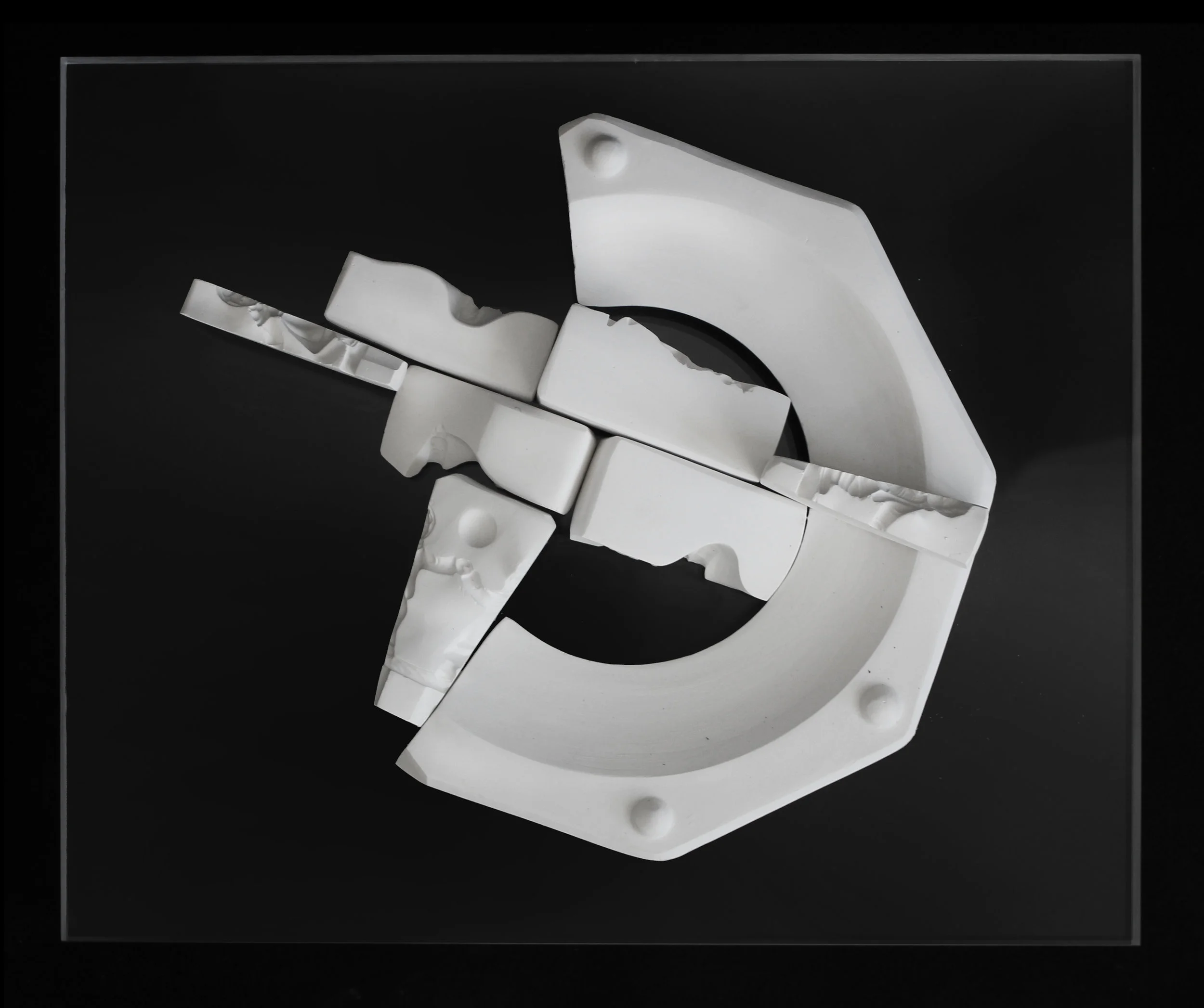 The plaster face, back of head, side of the head, elongated neck and shoulder are place on an acrylic assembled jig meant for standardized cutting.